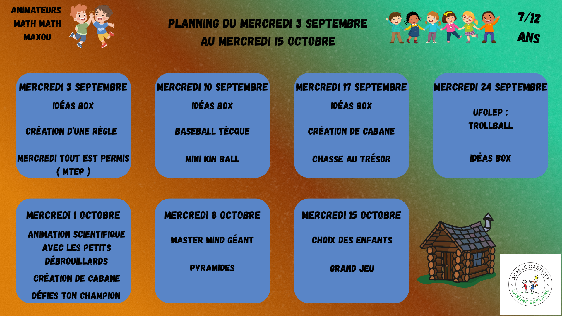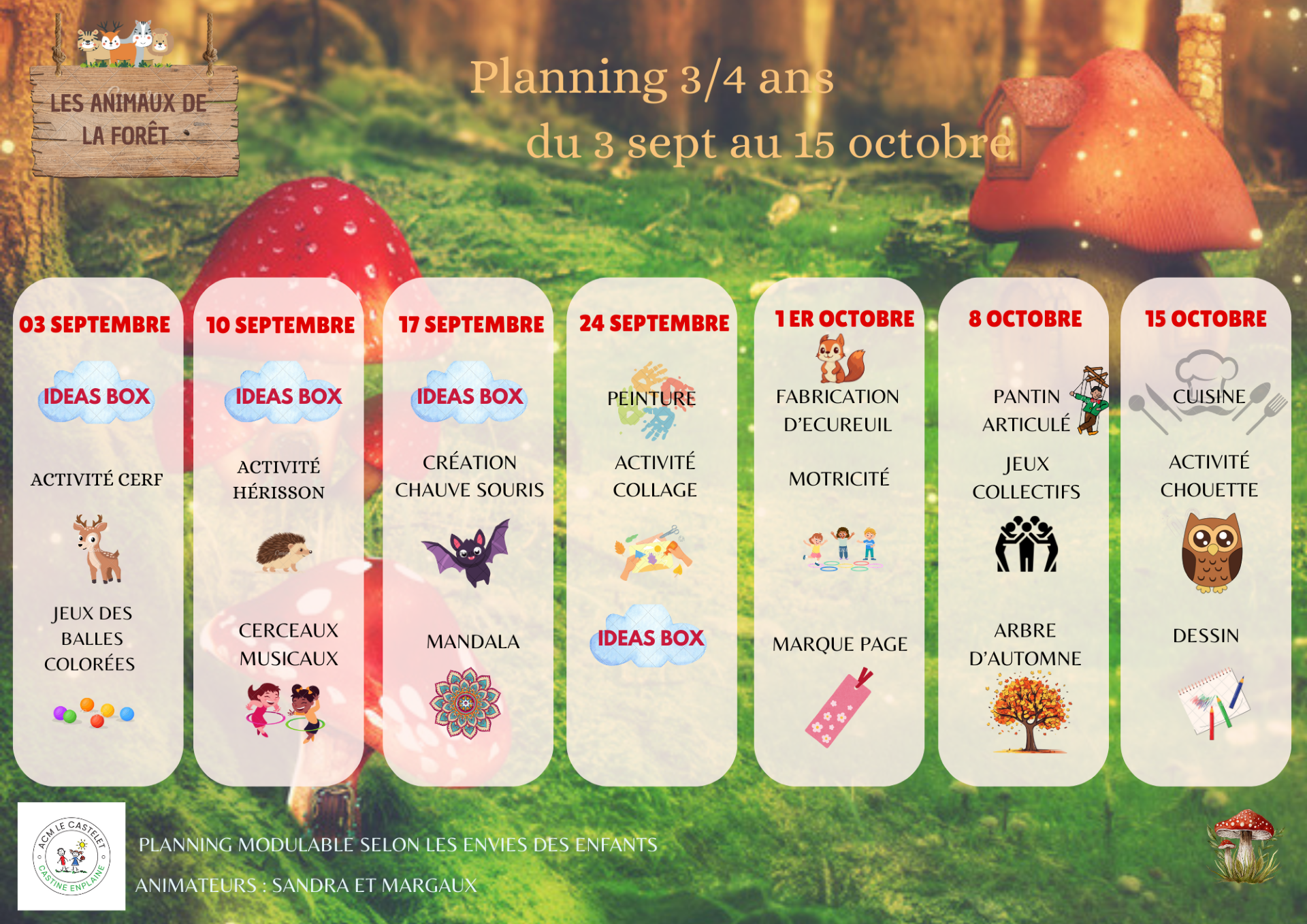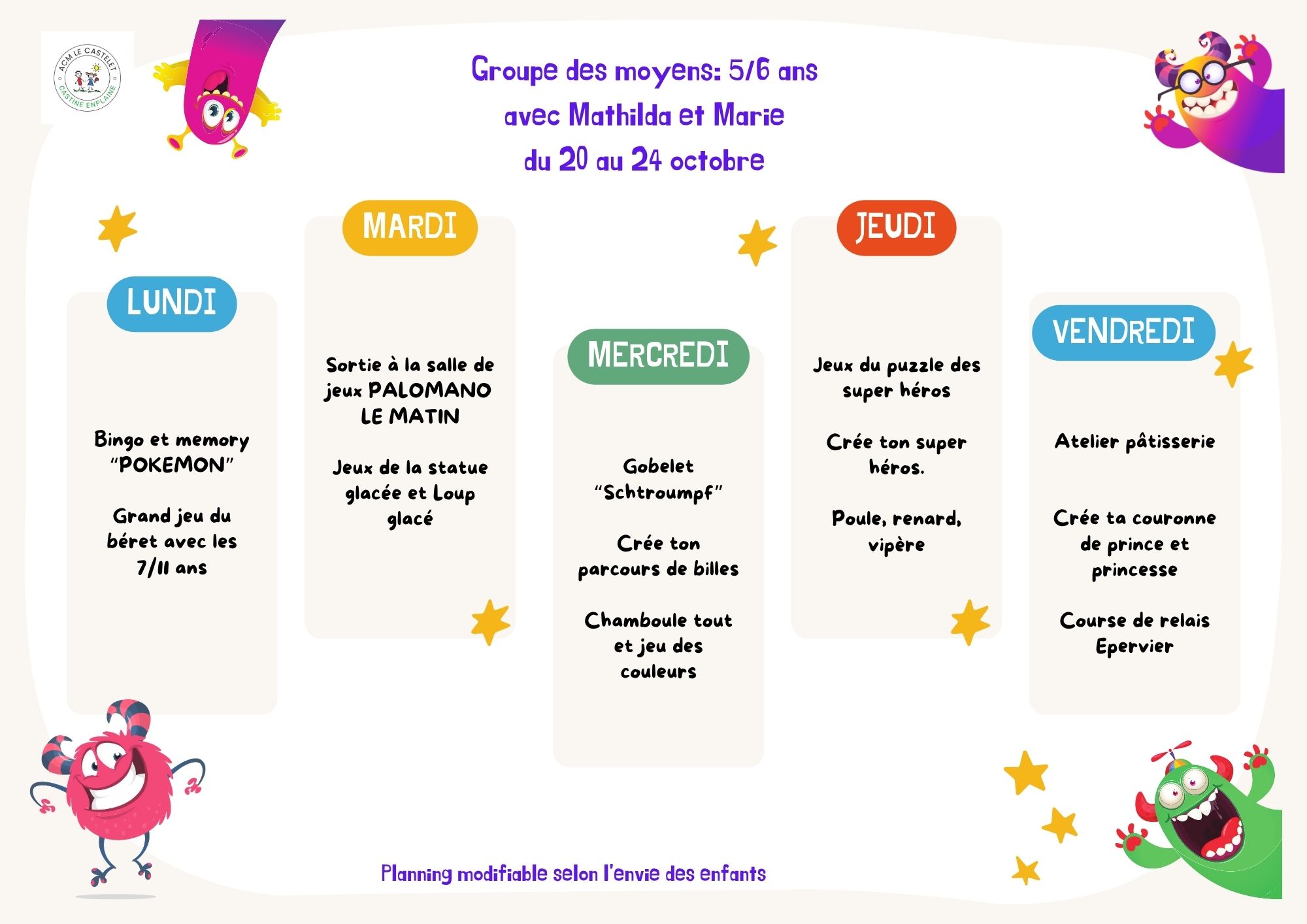 Le Centre de Loisirs est ouvert tous les mercredis et pendant les vacances scolaires de 7h30 à 18h30.