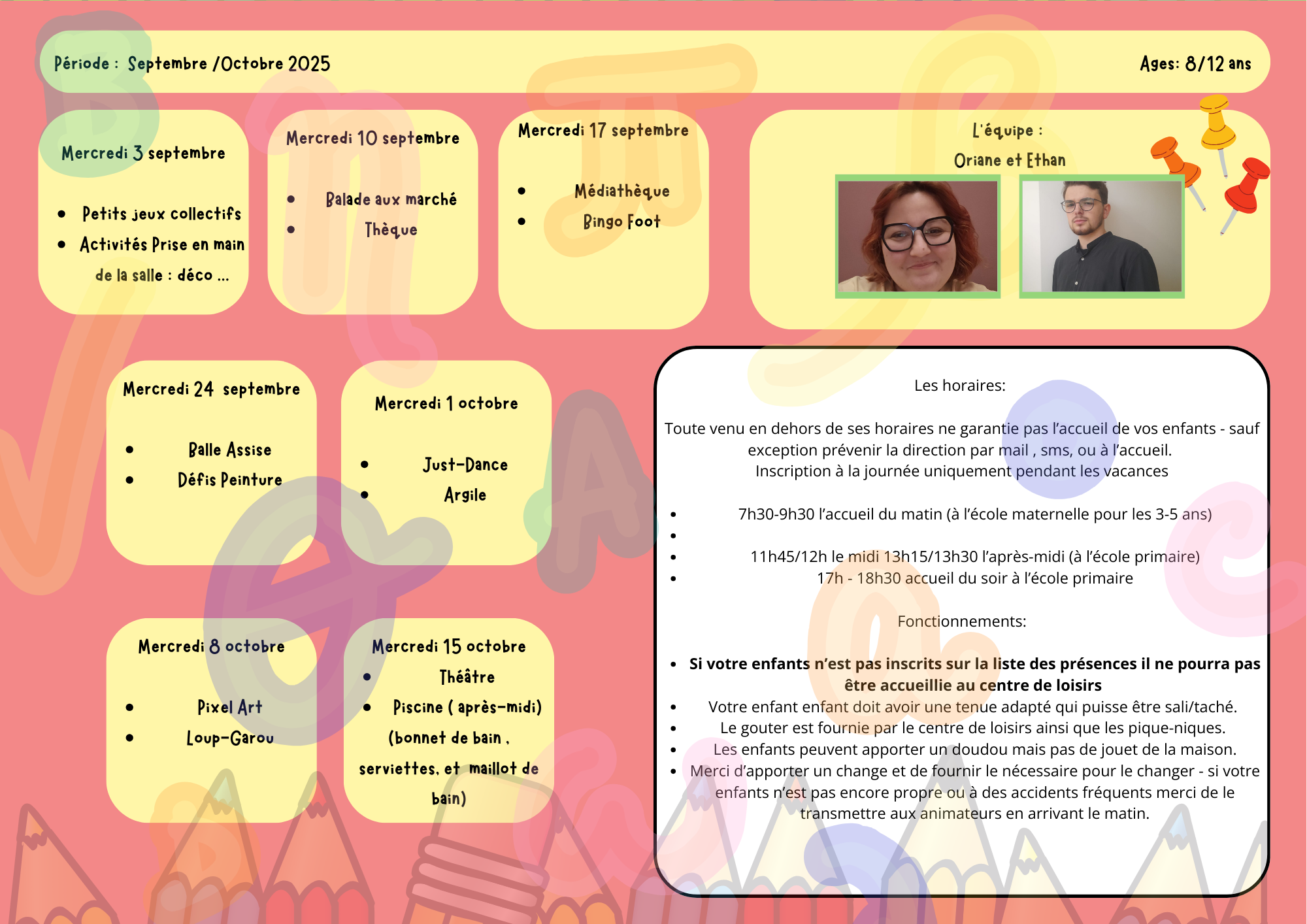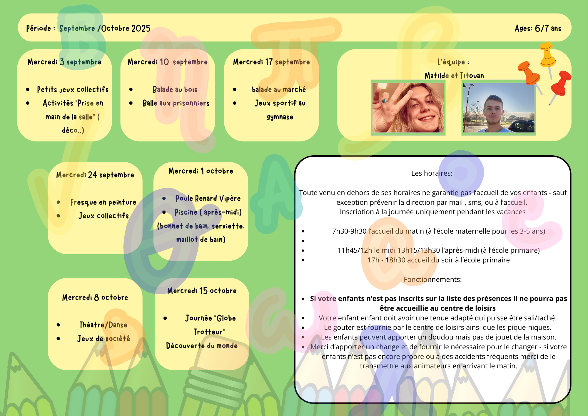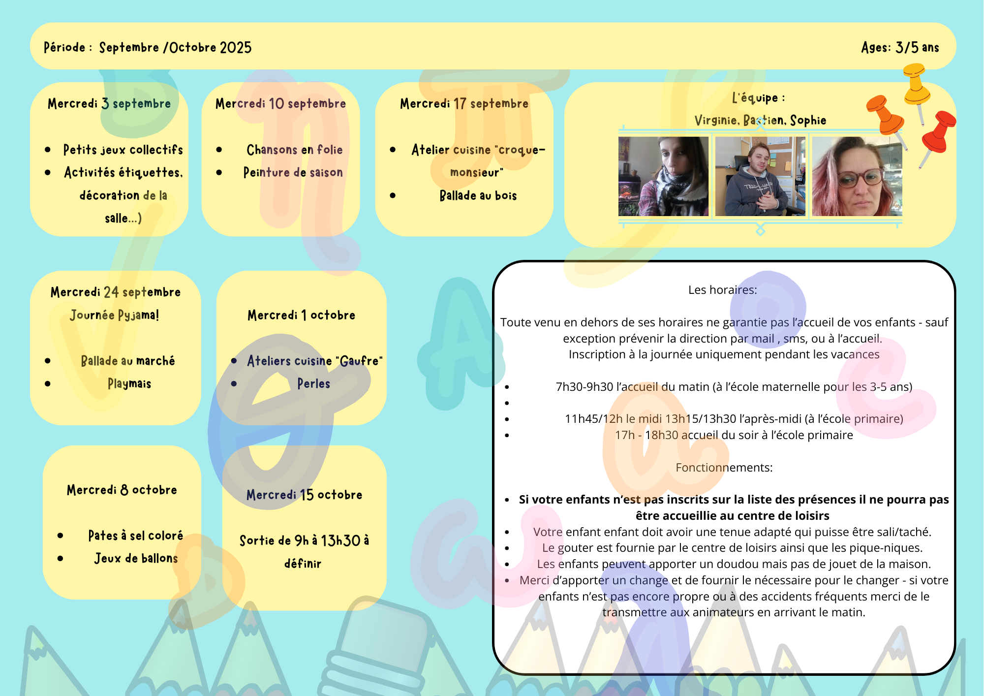 Le centre de Loisirs est ouvert tous les mercredis et pendant les vacances scolaires.