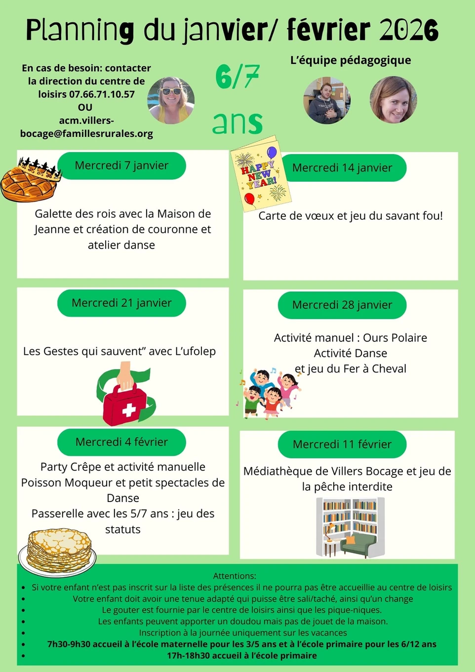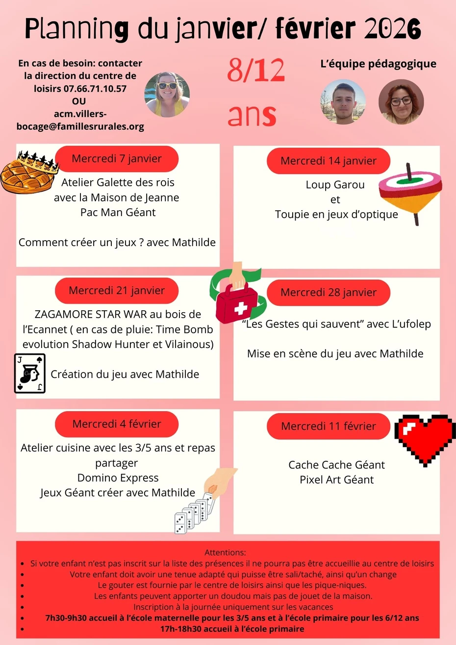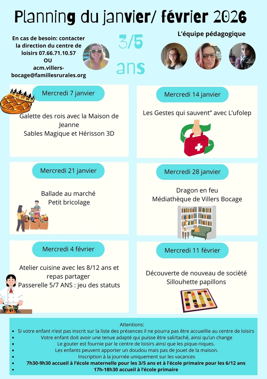 PLANNING DES MERCREDIS DE JANVIER ET FEVRIER SUR LE CENTRE DE VILLERS-BOCAGE