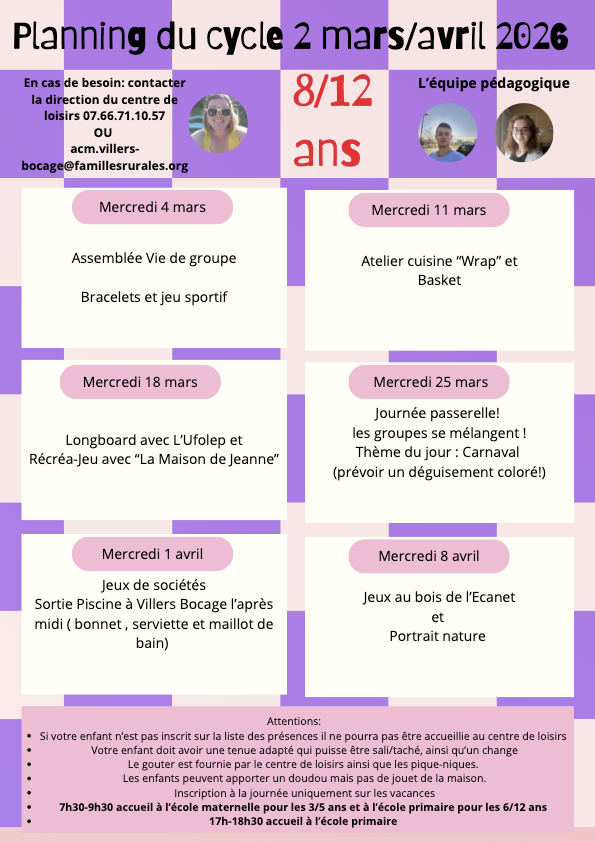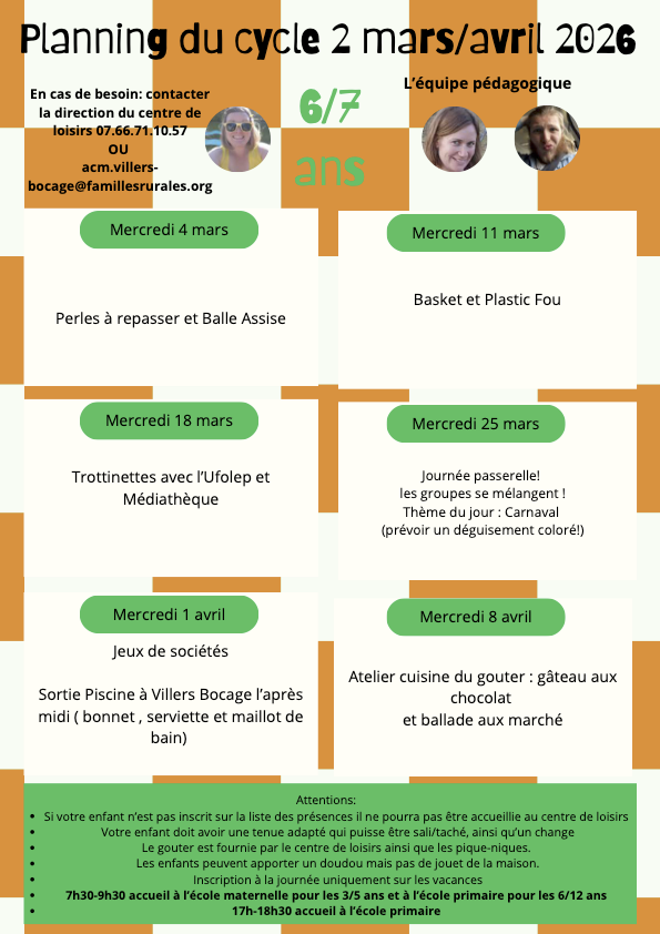 PLANNING DES VACANCES DE PRINTEMPS 2026 SUR LE CENTRE DE VILLERS-BOCAGEA venir...